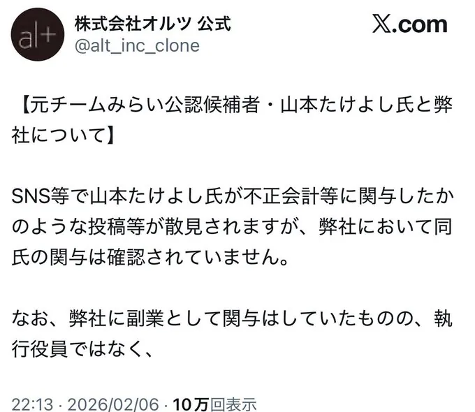 SNS等で山本たけよし氏が不正会計等に関与したかのような投稿等が散見されますが、弊社において同氏の関与は確認されていません。